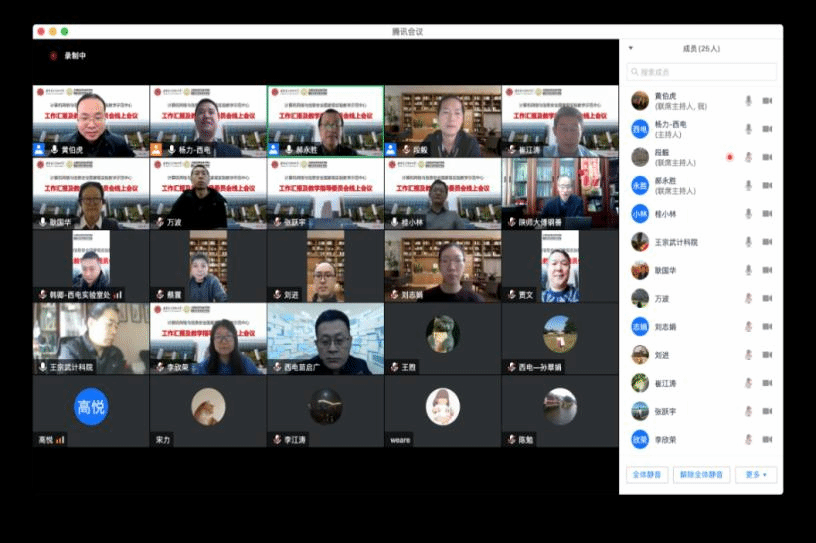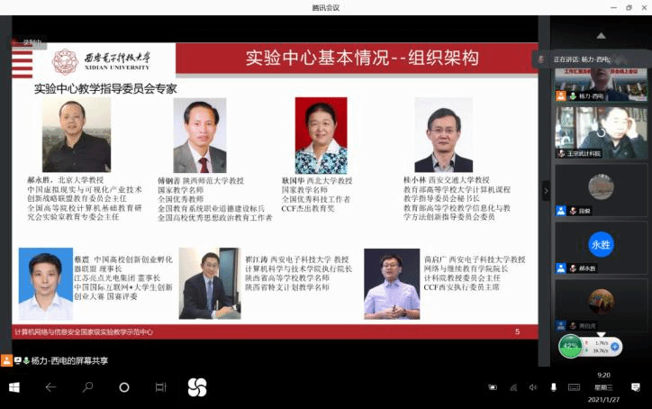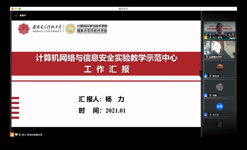 (通讯员 段毅 黄伯虎)1月27日上午,计算机网络与信息安全国家级实验教学示范中心通过腾讯会议举行了“工作汇报及教学指导委员会线上会议”。参加此次会议的教学指导委员会专家有:北京大学郝永胜教授、陕西师范大学傅钢善教授、西北大学耿国华教授、西安交通大学桂小林教授、中国高校创新创业孵化器联盟理事长蔡震、西安电子科技大学崔江涛教授和苗启广教授。学校及学院参会代表有:学校实验室与设备处副处长(主持工作)韩卿、学院教学副院长万波,实验示范中心主任杨力、副主任贾文、王宗武、黄伯虎、张跃宇及实验示范中心教师等30余人。本次会议由杨力主任和郝永胜教授共同主持。