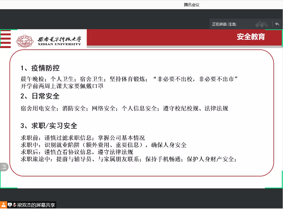 首先,辅导员汪龙老师在安全教育方面重申了校园疫情防控的相关要求,提醒同学们返校后要注意做好个人防护,打扫宿舍卫生,及时开窗通风,“非必要不出校,非必要不出市”;强调同学们要严格遵守请销假制度,注意消防安全、网络安全,遵守校纪校规、法律法规;他还提到,同学们在面对海量实习招聘信息时要“擦亮眼”,提高警惕,保护好自己的人身安全和财产安全,严防诈骗。