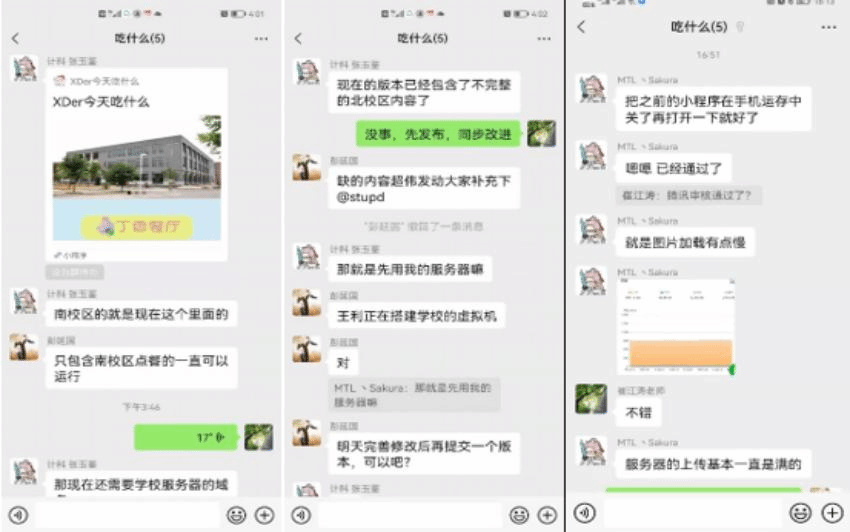 针对小程序运行之初,访问带宽受限、并行处理能力弱、小程序发布审核时间久等问题,bat365在线客服崔江涛教授、彭延国副教授带领研究生一起帮助张玉鉴加班加点提供解决方案,设计了支持高并发的部署方案,统筹协调计算中心开辟了专用虚拟服务器资源,争分夺秒完成了应用迁移,同时联系腾讯公司加速小程序审核,确保了“XDer今天吃什么”小程序及时发布。目前云选餐服务可以正常使用,后续将根据同学们的建议进一步完善相关功能。