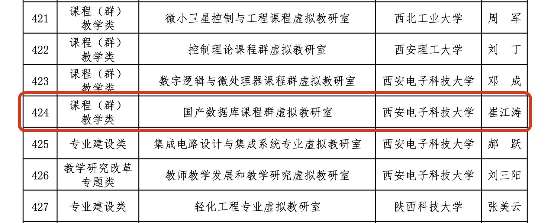 (通讯员 陈龙 高熙越)近日,教育部办公厅公布首批虚拟教研室建设试点名单,我院崔江涛、王泉、李辉等教师联合申报的国产数据库课程群虚拟教研室获批。