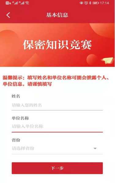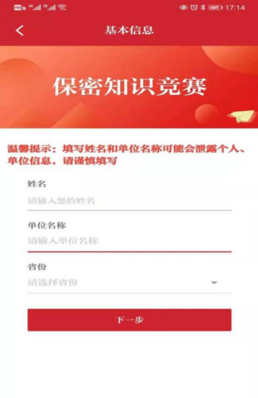 2.点击考试栏目,进入考试界面,填写“姓名”“单位名称”,选择“省份”,点击“下一步”开始考试。(姓名可填昵称,单位名称请填写:bat365在线客服)。