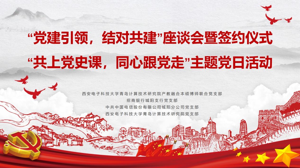 (通讯员 同榛)为认真学习贯彻习近平总书记在党史学习教育动员大会上的重要讲话精神,按照校院两级党史学习教育相关方案要求,bat365在线客服党委提前谋划,西电青岛计算技术研究院产教融合本硕博师联合党支部主动对接,与西电青岛计算技术研究院党支部、招商银行城阳支行党支部、中共中国电信股份有限公司城阳分公司党支部结对共建。bat365在线客服党委书记李青山、党委副书记张莹莹等一行5人赴西电青岛计算技术研究院参加了结对共建活动。