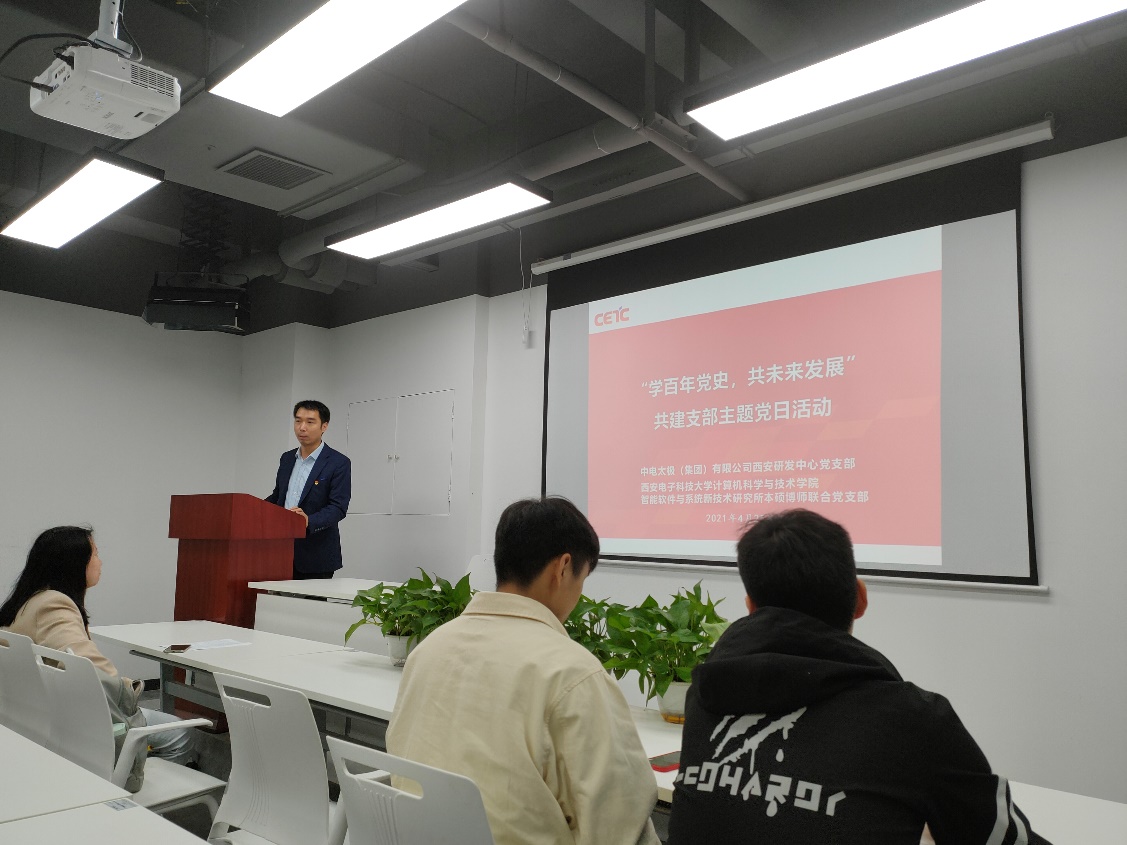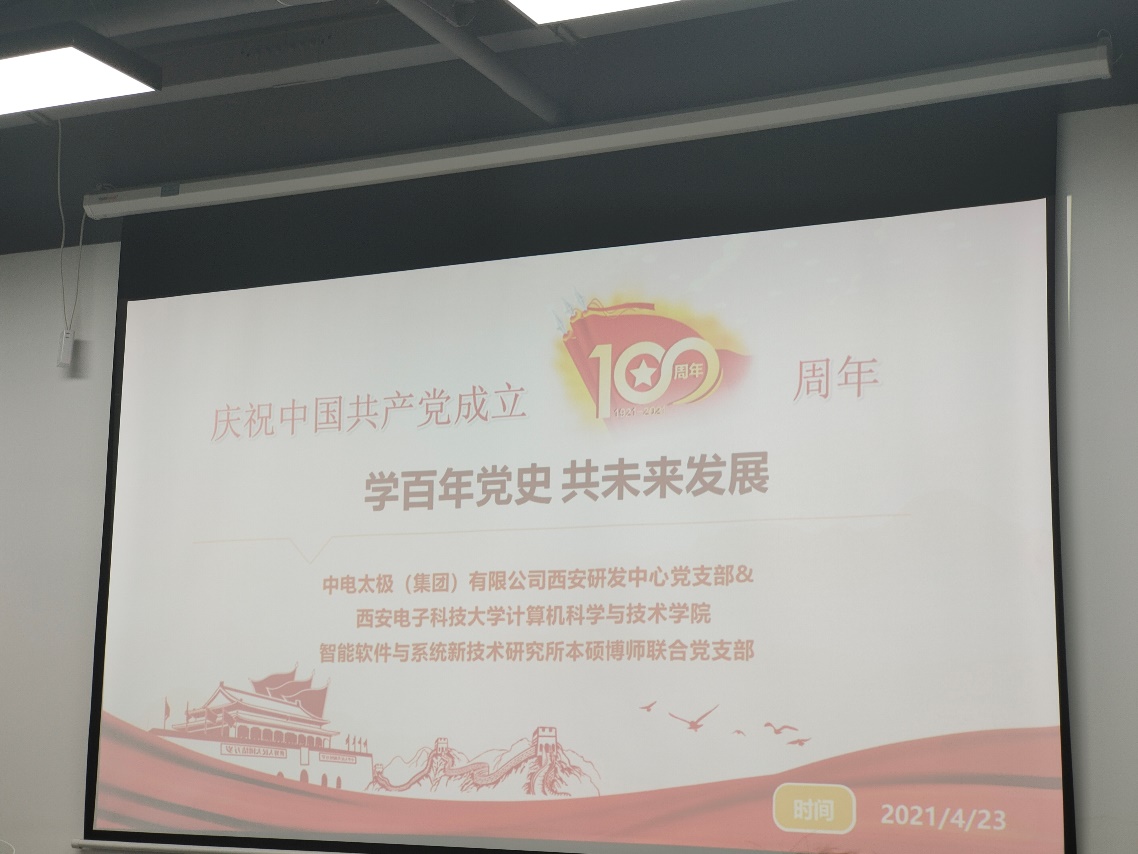 (通讯员 魏彬)为响应习近平总书记“学党史、悟思想、办实事、开新局”的号召,大力发扬红色传统、传承红色基因、赓续共产党人的精神血脉,bat365在线客服智能软件与系统新技术研究所本硕博师联合党支部和结对共建党支部——中电太极(集团)有限公司西安研发中心党支部于2021年4月25日联合开展“学百年党史 共未来发展”主题党日活动,用党的奋斗历程和伟大成就鼓舞斗志、明确方向,用党的光荣传统和优良作风坚定信念、凝聚力量,用党的实践创造和历史经验启迪智慧、砥砺品格。活动在中电太极(集团)有限公司西安研发中心开展,由支部书记王璐主持。